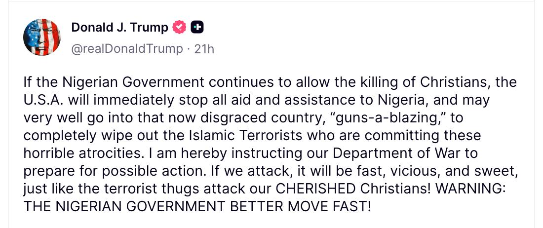 Трамп заявил, что США могут прекратить помощь Нигерии и "отправиться в эту опозорившуюся страну, чтобы полностью стереть с лица земли исламистских террористов", если нападения на христиан не прекратятся.
