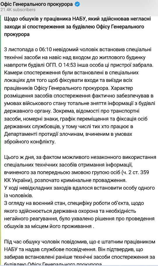 Позже Офис генерального прокурора (ОГП) прокомментировал обыск у сотрудника НАБУ, о котором ранее сообщило Бюро.