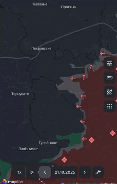 "Центр Покровска был – и, скорее всего, остается – под контролем Украины. Россияне никогда не входили в этот район, чтобы провести акцию с флагом. Украинцы никогда не публиковали видеозаписи ударов по россиянам в этом районе", - комментирует Репке и публикует свою карту, сделанную на основе фото и видео с фронта.