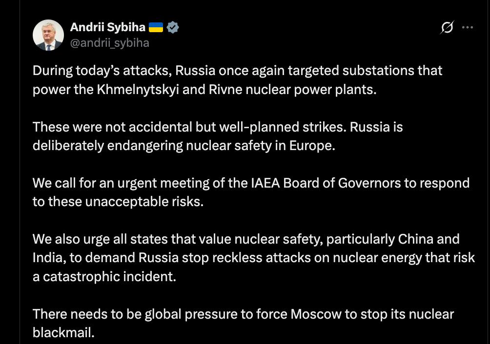 "Россия намеренно ставит под угрозу ядерную безопасность в Европе. Мы призываем к срочному созыву заседания Совета управляющих МАГАТЭ для реагирования на эти неприемлемые риски. Мы также настоятельно призываем все государства, которые ценят ядерную безопасность, особенно Китай и Индию, потребовать от России прекратить безрассудные атаки на ядерную энергетику, которые могут привести к катастрофическим последствиям. Необходимо глобальное давление, чтобы заставить Москву прекратить ядерный шантаж", - написал глава МИД.