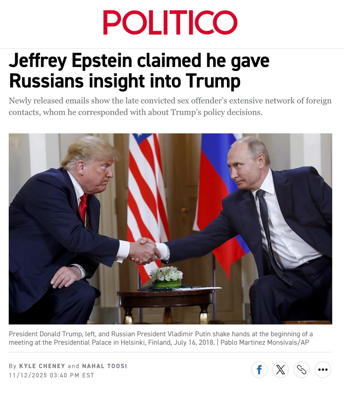 По информации издания, Эпштейн в 2018 году, за месяц до встречи Трампа и Владимира Путина, пытался передать России через главу МИД ДРФ Сергея Лаврова информацию про президента США.