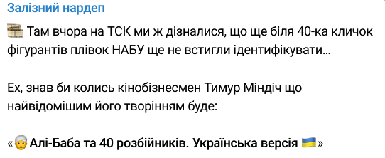 Напомним, что Али-Баба, по данным того же Железняка, - это глава Офиса президента Андрей Ермак. Сейчас пошли слухи о его скорой отставке в связи с коррупционным скандалом с Миндичем.