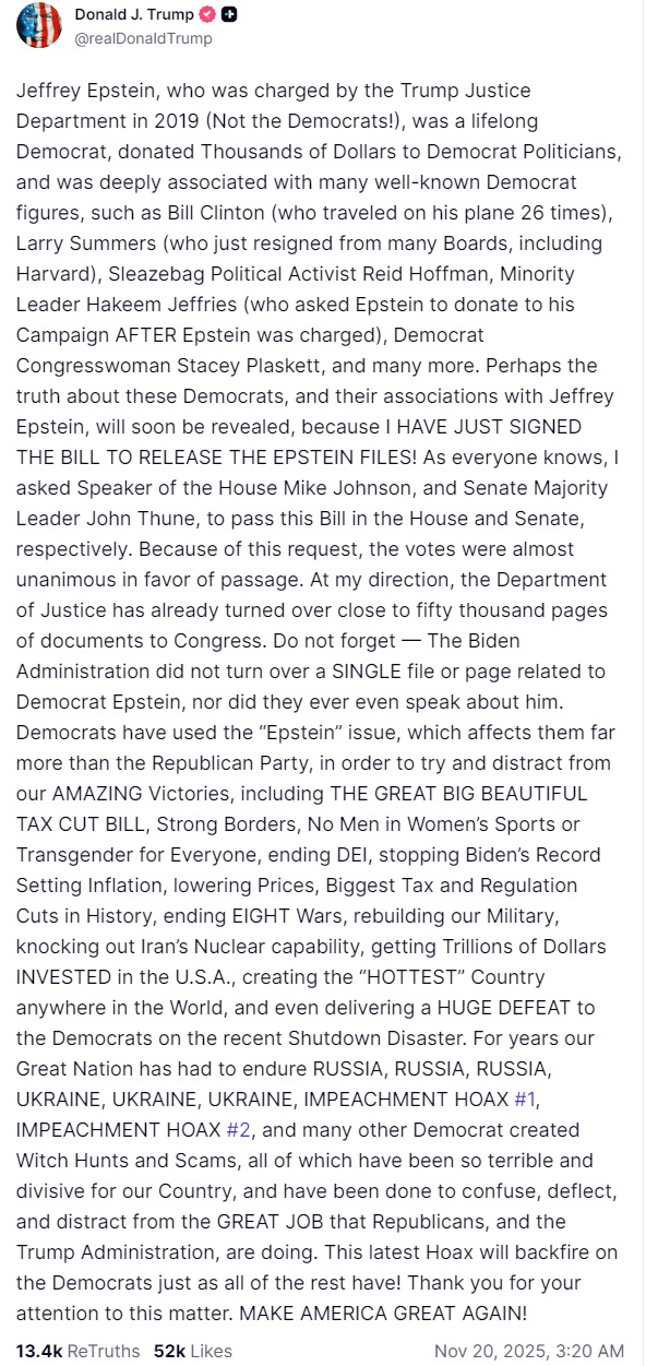 "Возможно, правда об этих демократах и ​​их связях с Джеффри Эпштейном скоро откроется, потому что я только что подписал законопроект о раскрытии материалов Эпштейна. Я попросил спикера палаты представителей Майка Джонсона и лидера большинства в сенате Джона Тьюна одобрить этот законопроект в палате представителей и сенате соответственно. Благодаря этой просьбе голосование было практически единогласным в пользу принятия. По моему указанию Министерство юстиции уже передало конгрессу почти пятьдесят тысяч страниц документов", - написал глава Белого дома.