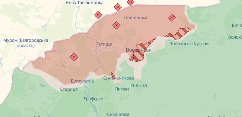 12:49 Российские войска зашли в Ямполь, а также впервые за долгое время продвинулись в Волчанске, свидетельствует карта Deep State.