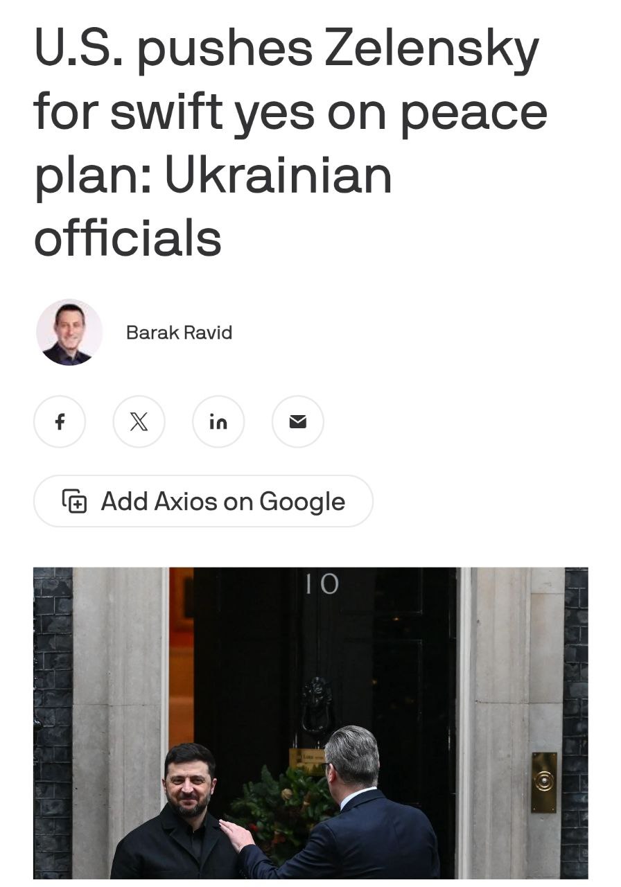 Исходя из статьи Axios, Зеленский не отказал в этом американцам прямо, а сослался на то, что еще не успел ознакомиться детально с обновленным планом США, так как "получил его лишь час назад и еще не читал" (напомним, именно в этом украинского президента упрекал Трамп)