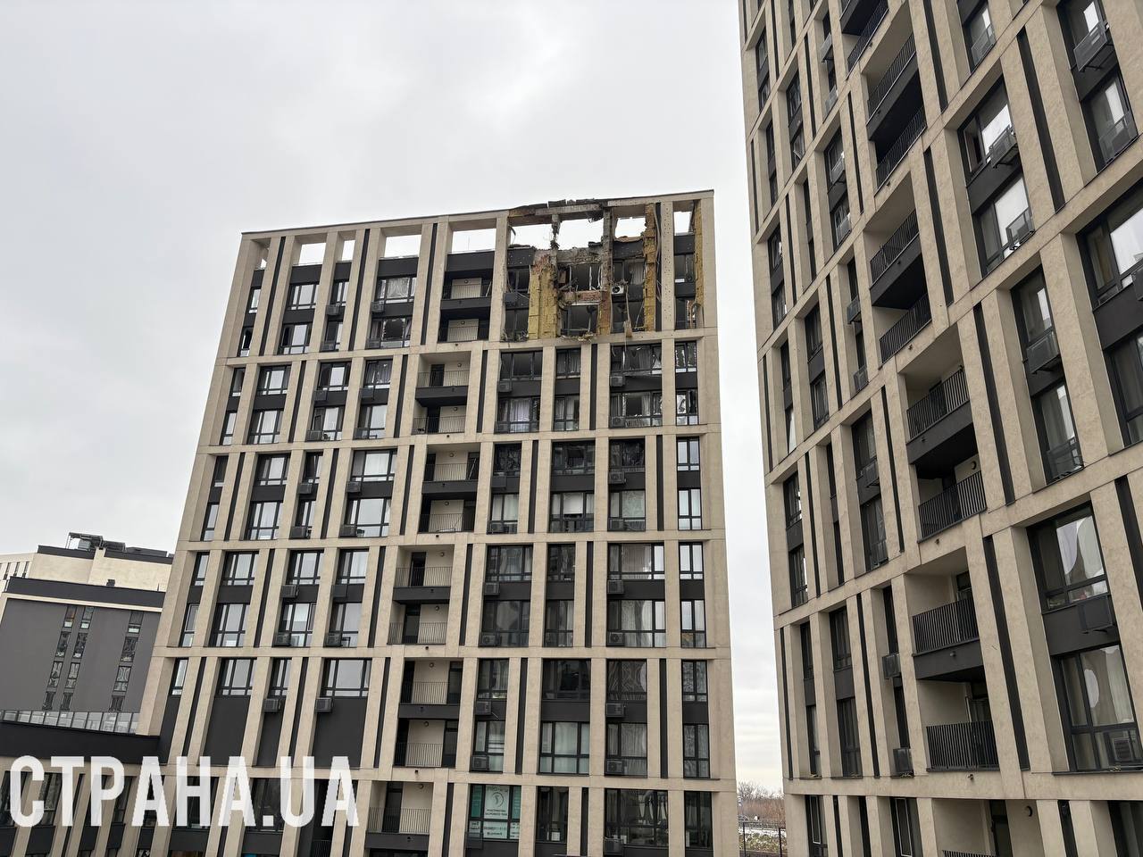 В результате удара повреждена верхняя фасадная часть дома. Существенные разрушения получили две квартиры на 11 и 12 этажах. В момент удара в этих квартирах людей не было, пострадавших нет.