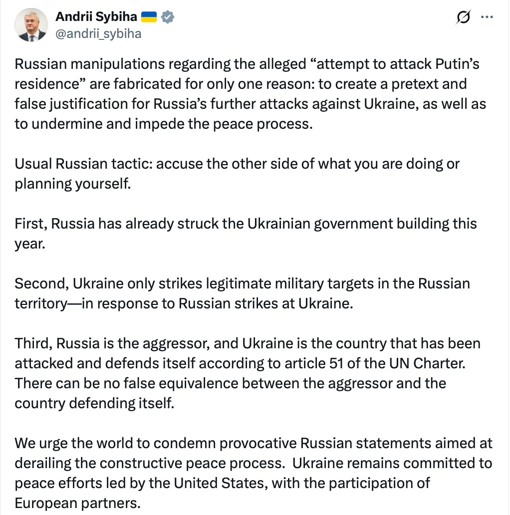 Об этом заявил в соцсети X глава МИД Украины Андрей Сибига.