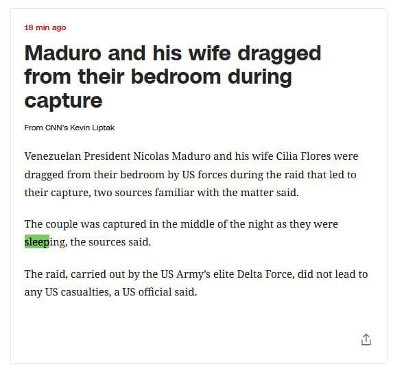16:31 Американский спецназ из отряда "Дельта" захватили Мадуро с супругой, пока они спали в своей резиденции.