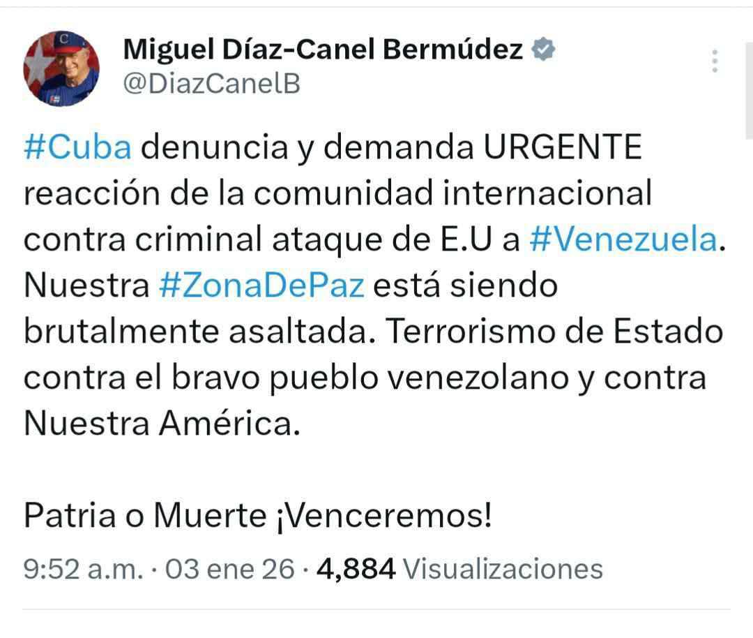 Президент Кубы Мигель Диас-Канель обвинил США в нападении на Венесуэлу, заявив, что Гавана требует срочной реакции мира на "преступную атаку США на Венесуэлу".