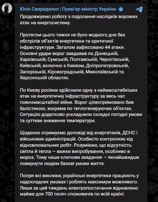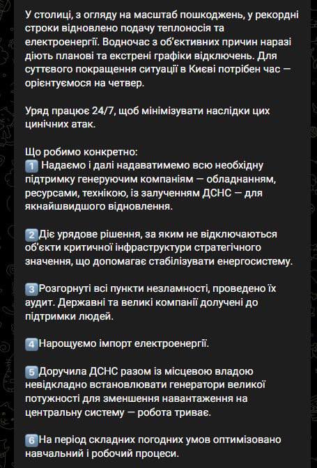 "В столице, с учётом масштабов повреждений, в рекордные сроки восстановлена подача теплоносителя и электроэнергии. При этом по объективным причинам пока действуют плановые и экстренные графики отключений. Для существенного улучшения ситуации в Киеве нужно время - ориентируемся на четверг", - заявила Свириденко.