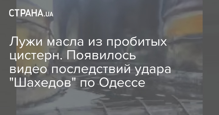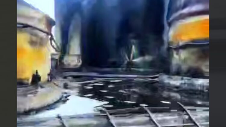 На видео стоянка с масловозами покрылась слоем продукта в несколько сантиметров. Можно заметить, что струи масла бьют из повреждённых осколками цистерен.