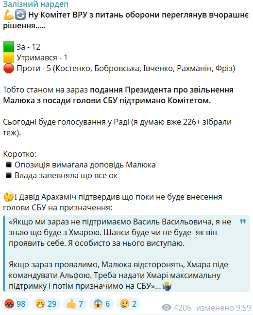 А утверждать нового постоянного главу СБУ пока не будут, подтвердил глава фракции "Слуга народа" Давид Арахамия: "Шансы будут или не будут – как он проявит себя. Я лично за него выступаю. Если сейчас провалим, Малюка отстранят, Хмара пойдёт командовать "Альфой". Нужно предоставить Хмаре максимальную поддержку и потом назначим на СБУ".