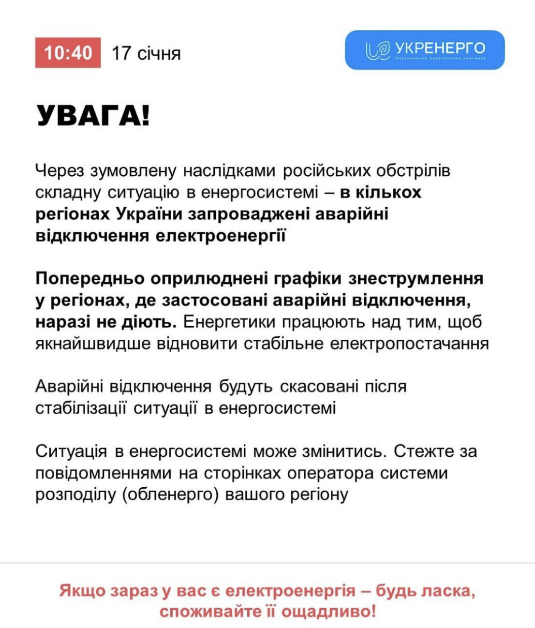 10:44 "Укрэнерго" сообщило о введении аварийных отключений в ряде регионов Украины - из-за сложной ситуации в энергосистеме после обстрелов.