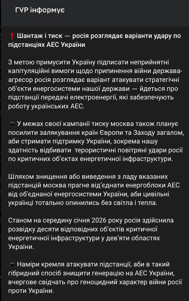 "Путем уничтожения или вывода из строя указанных подстанций Москва стремится отсоединить энергоблоки АЭС от объединенной энергосистемы Украины, чтобы украинцы полностью остались без света и тепла. По состоянию на середину января 2026 года Россия провела разведку десяти соответствующих объектов критической энергетической инфраструктуры в девяти областях Украины", - заявили в ГУР.