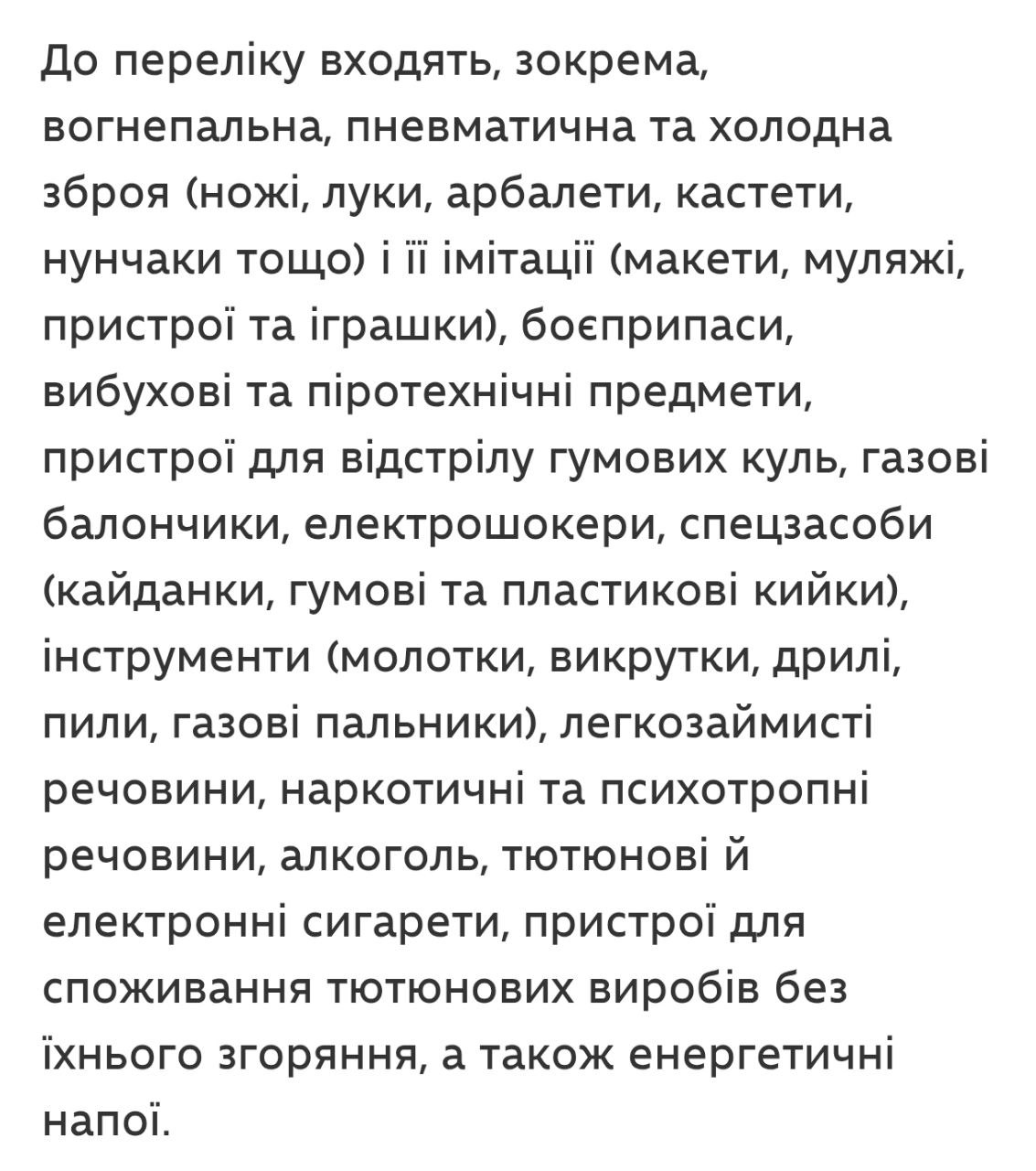 Также запрещены боеприпасы, взрывчатка и пиротехника, газовые баллончики, электрошокеры, спецсредства вроде наручников и дубинок, инструменты, легковоспламеняющиеся вещества, наркотические и психотропные вещества, алкоголь, обычные и электронные сигареты, устройства для нагревания табака и энергетические напитки.