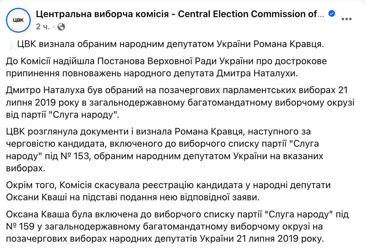 "ЦИК признала избранным народным депутатом Украины Романа Кравца", - говорится в сообщении.