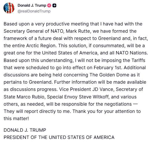 "Основываясь на очень продуктивной встрече, которую я провел с генеральным секретарем НАТО Марком Рютте, мы сформировали рамки будущей сделки в отношении Гренландии и, по сути, всего Арктического региона. Это решение, если оно будет закончено, будет отличным для Соединенных Штатов Америки и всех стран НАТО. Исходя из этого понимания, я не буду вводить тарифы, которые должны были вступить в силу 1 февраля. Ведутся дополнительные обсуждения в отношении Золотого купола, поскольку он относится к Гренландии. Дополнительная информация будет предоставлена по мере продвижения обсуждений. Вице-президент Джей Ди Вэнс, государственный секретарь Марко Рубио, специальный посланник Стив Виткофф и многие другие, по мере необходимости, будут отвечать за переговоры - они будут отчитываться непосредственно передо мной", - написал Трамп.