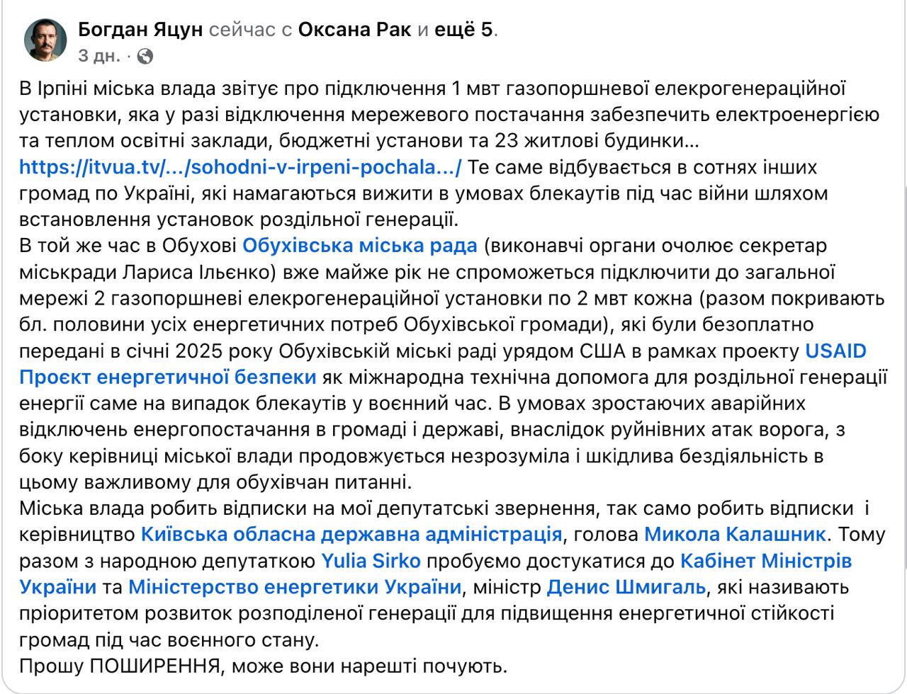 По его словам, две переданные США газопоршневые электрогенерационные установки по 2 МВт каждая покрыли бы половину потребностей общины. Они были подарены горсовету в январе 2025 года правительством США в рамках проекта USAID, но с тех пор так и не были запущены даже в условиях блэкаутов.