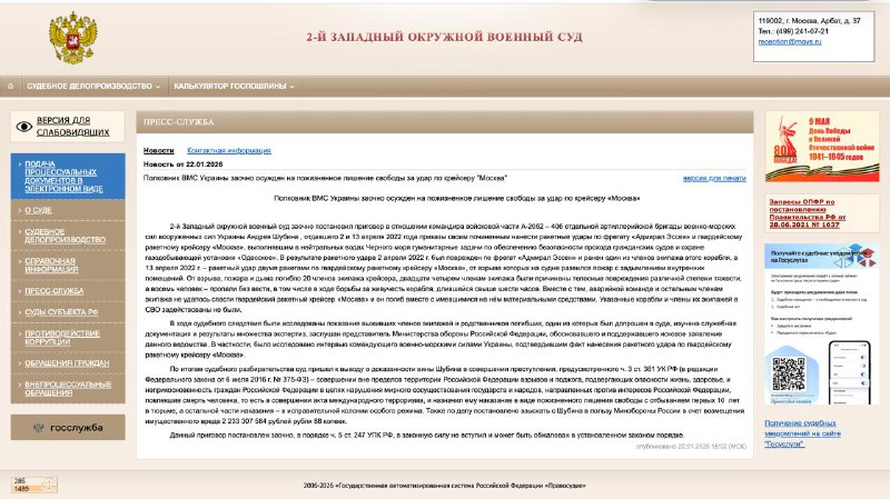 "Медиазона" пишет, что 2-й Западный окружной военный суд, расположенный в Москве, недавно вынес приговор по делу о затоплении крейсера. К пожизненному сроку заочно приговорили командира 406 артиллерийской бригады ВМС Украины Андрея Шубина, который, по версии российского следствия, отдал приказы нанести ракетные удары по крейсеру "Москва" и фрегату "Адмирал Эссен".