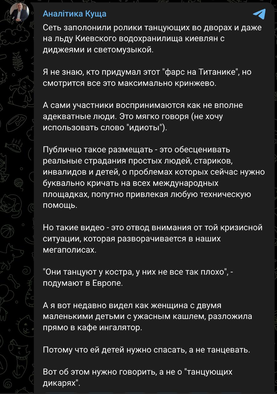 "Я не знаю, кто придумал этот "фарс на "Титанике", но смотрится все это максимально кринжово. А сами участники воспринимаются как не вполне адекватные люди. Это, мягко говоря, (не хочу использовать слово "идиоты"). Публично такое размещать – это обесценивать реальные страдания простых людей, стариков, инвалидов и детей, о проблемах которых сейчас нужно буквально кричать на всех международных площадках, попутно привлекая любую техническую помощь. Но такие видео – это отвод внимания от той кризисной ситуации, которая разворачивается в наших мегаполисах. "Они танцуют у костра, у них не всё так плохо", – подумают в Европе. А я вот недавно видел, как женщина с двумя маленькими детьми с ужасным кашлем, разложила прямо в кафе ингалятор. Потому что ей детей нужно спасать, а не танцевать. Вот об этом нужно говорить, а не о "танцующих дикарях", – написал Кущ.