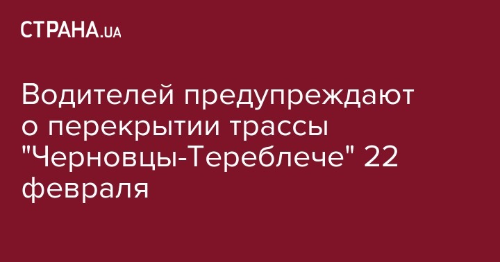 Завтра, 22 февраля, в Черновицкой области планируется перекрытие трассы международного значения "Черновцы-Тереблече". Об этом сообщает пресс-служба Западного регионального управления Госпогранслужбы Украины на странице в Facebook.