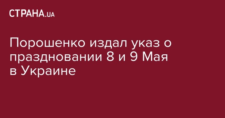 Президент Украины Петр Порошенко подписал указ о мероприятиях в 2017 году ко Дню памяти и примирения (8 мая) и 72-й годовщине победы над нацизмом во Второй мировой войне (9 мая). Документ опубликован на сайте Главы государства.