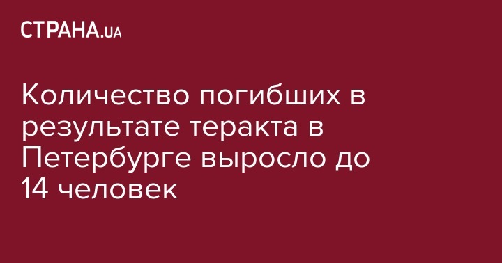 В Минздраве России заявили, что число жертв взрыва в метро Санкт-Петербурга выросло до 14. Об этом сообщают РИА Новости.