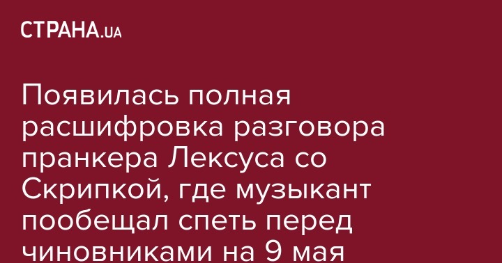 "Страна" приводит полную расшифровку разговора пранкера Андрея Столярова (известного по прозвищу Лексус) с украинским певцом Олегом Скрипкой. Пранкер представился главой МВД Украины Арсеном Аваковым.