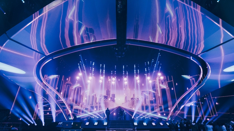 22.16 - Представитель Австрии поет на фоне гигантского серебристого полумесяца. По сцене Евровидения-2017 стелется туман.