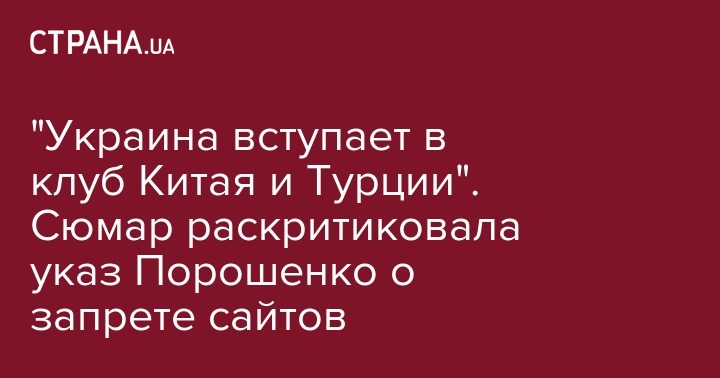 Украина после указа президента про блокировку в стране российских сайтов и сосетей попадает в "клуб" таких стран как Китай и Турция. Об этом заявила народный депутат и глава комитета по вопросам свободы слова и информационной политики Верховной Рады Виктория Сюмар ("Народный фронт", который входит в парламентскую коалицию) передает "Эспрессо.TV".