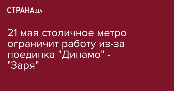 В воскресенье, 21 мая, в связи с проведением на НСК "Олимпийский" футбольного матча между командами "Динамо" (Киев) и "Заря" (Луганск), возможны некоторые изменения в работе столичного метрополитена. Об этом сообщает в пресс-службе киевского метрополитена.