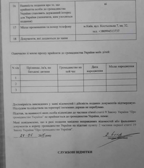 Но экс-президент Грузии и экс-глава Одесской ОГА Михаил Саакашвили заявил о том, что подпись в копии анкеты на получение украинского гражданства, которая была ранее обнародована, принадлежит не ему.