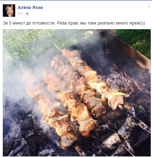 Она подписала  фото шашлыка "5 минут до готовности, Рева прав, мы таки реально много жрем"