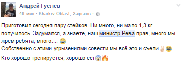 "Приготовил сегодня пару стейков. Ни много, ни мало 1,3 кг получилось. Задумался, а знаете, наш министр Рева прав, много мы жрём ребята, много... Собственно с этими угрызениями совести мы всё это и съели. Кто хорошо тренируется, хорошо ест", - написал он.