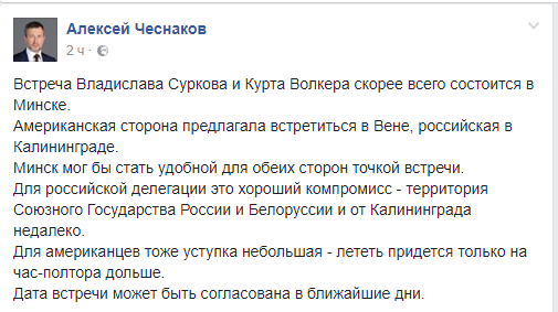 Встреча представителей США и России в прямых переговорах по Донбассу - помощника президента России Владислава Суркова и спецпредставителя Госдепа Курта Волкера - может пройти в Минске. Об этом сообщил в Facebook директор Центра политической конъюнктуры Алексей Чеснаков.
