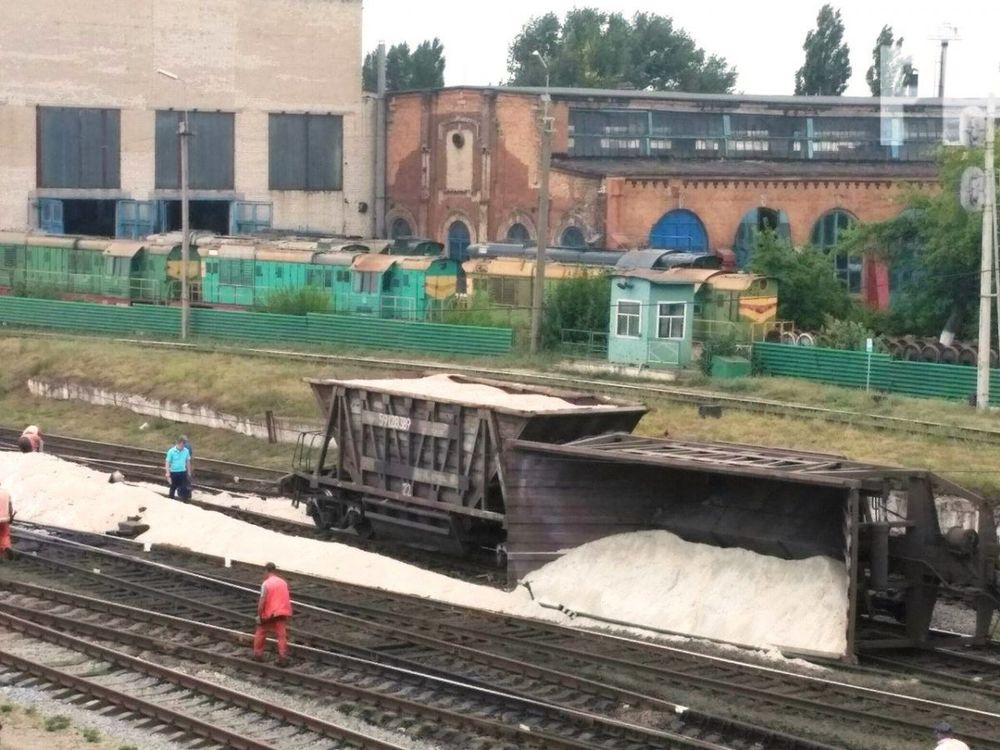 Появились фото, как на станции в Запорожской области перевернулся груженый вагон