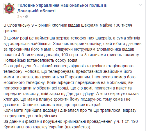 В Славянске 9-летний мальчик вынес из дома мошенникам почти 130 тыс. грн. Об этом сообщает Главное управление Национальной полиции в Донецкой области в Facebook.