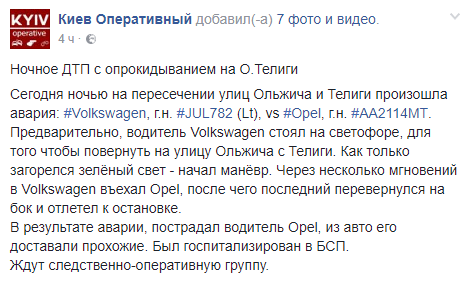 Инцидент произошел на пересечении улиц Ольжича и Телиги. По предварительным данным, водитель Volkswagen стоял на светофоре, чтобы повернуть на улицу Ольжича с Телиги. Как только загорелся зеленый свет - он начал маневр.
