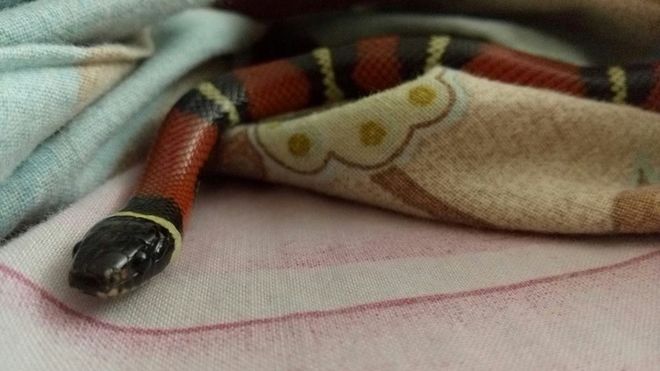 Сначала ее приняли за ядовитого кораллового аспида. При детальном рассмотрении специалисты выяснили, что это неядовитая королевская молочная змея.