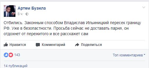 "Владислав Ильницкий пересек границу РФ. Уже в безопасности. Просьба сейчас не доставать парня, он отдохнет от пережитого и все расскажет сам", - написал на своей странице в Facebook бывший одесский журналист Артем Бузила.