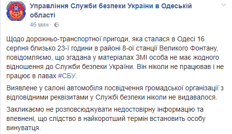 "По дорожно-транспортному происшествию, произошедшему в Одессе 16 августа около 23 часов в районе восьмой станции Большого Фонтана, сообщаем, что данное лицо не имеет никакого отношения к Службе безопасности Украины. Он никогда не работал и не работает в рядах СБУ.