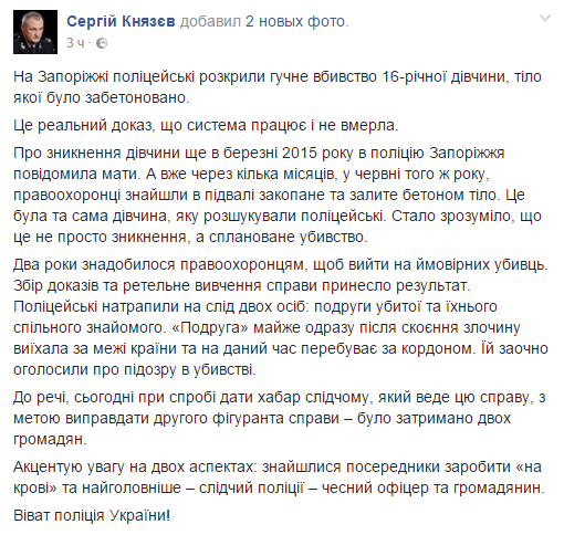 "Два года понадобилось правоохранителям, чтобы выйти на предполагаемых убийц. Сбор доказательств и тщательное изучение дела принесло результат. Полицейские напали на след двух человек: подруги убитой и их общего знакомого. "Подруга" почти сразу после совершения преступления выехала за пределы страны и в настоящее время находится за границей. Ей заочно объявили о подозрении в убийстве", - написал Князев.