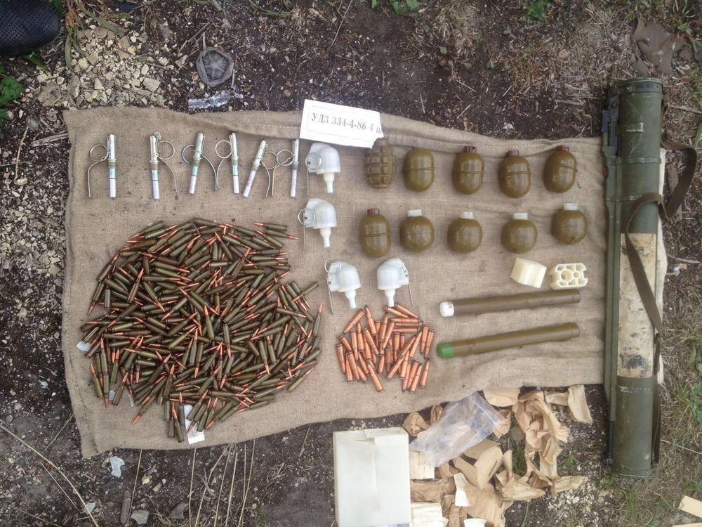 Судя по опубликованной фотографии в схроне находилось 10 ручных гранат, взрыватели к ним, гранатомет, а также десятки патронов.