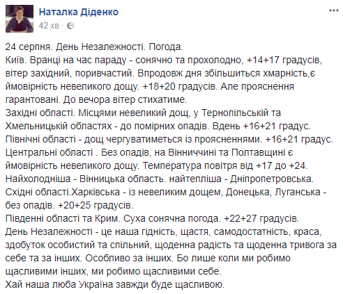 Завтра, 24 августа, украинцы будут отмечать 26-ю годовщину Дня независимости. Народные синоптики рассказали, что праздник выдастся прохладным, ожидаются небольшие дожди. Об этом на своей странице в соцсети Facebook сообщила синоптик Наталья Диденко.