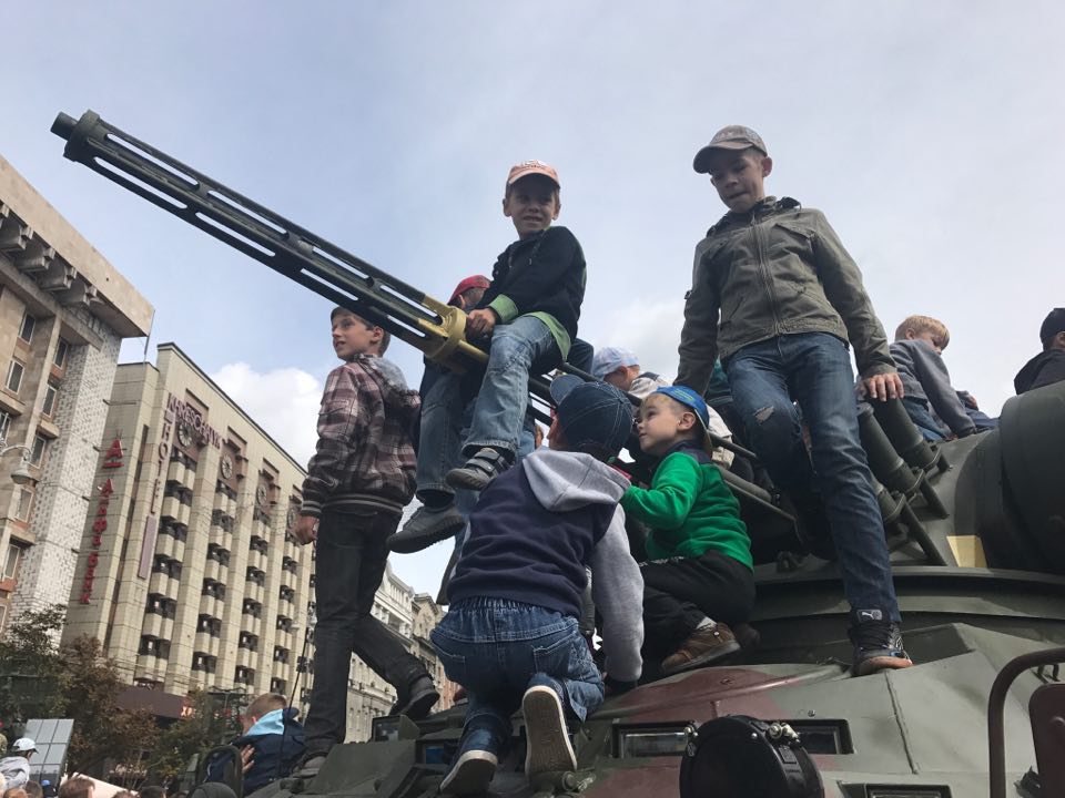 На параде присутствует большое количество детей. Им разрешают забираться на военную технику и фотографироваться.