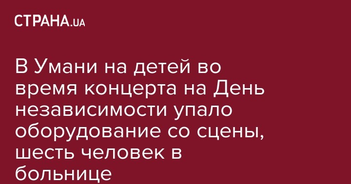 "Во время праздничного концерта по случаю Дня Независимости на центральной площади города Умань на детей, находившихся у сцены, упало сценическое оборудование. В результате падения пострадали шестеро детей от 11 до 14 лет. Детей доставили в больницу", - говорится в сообщении.