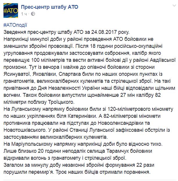 По заявлению штаба АТО, после 18.00 24 августа сепаратисты продолжали применять вооружение, калибр которого превышает 100 миллиметров и вести активные боевые действия в районе Авдеевской промзоны.