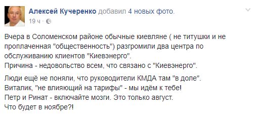 Экс-министр ЖКХ Алексей Кучеренко у себя в Facebook заявил, что нападения - дело рук не криминалитета, а простых киевлян, недовольных тарифами.