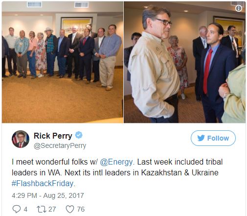 "Я встречаю прекрасных людей в министерстве (энергетики США - ред.). На прошлой неделе были встречи с лидерами племен в штате Вашингтон. На следующий - международные лидеры Казахстана и Украины", - отметил Перри в Twitter.