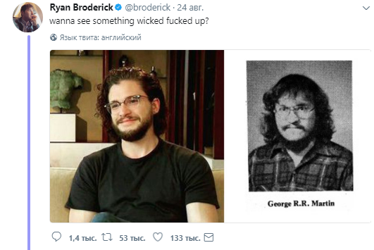 Сотрудник BuzzFeed Райан Бродерик обнародовал фото исполнителя роли Джона Сноу в "Игре престолов" и создателя цикла романов "Песнь льда и пламени", которые легли в основу сериала. Своим наблюдением Бродерик поделился в Twitter.